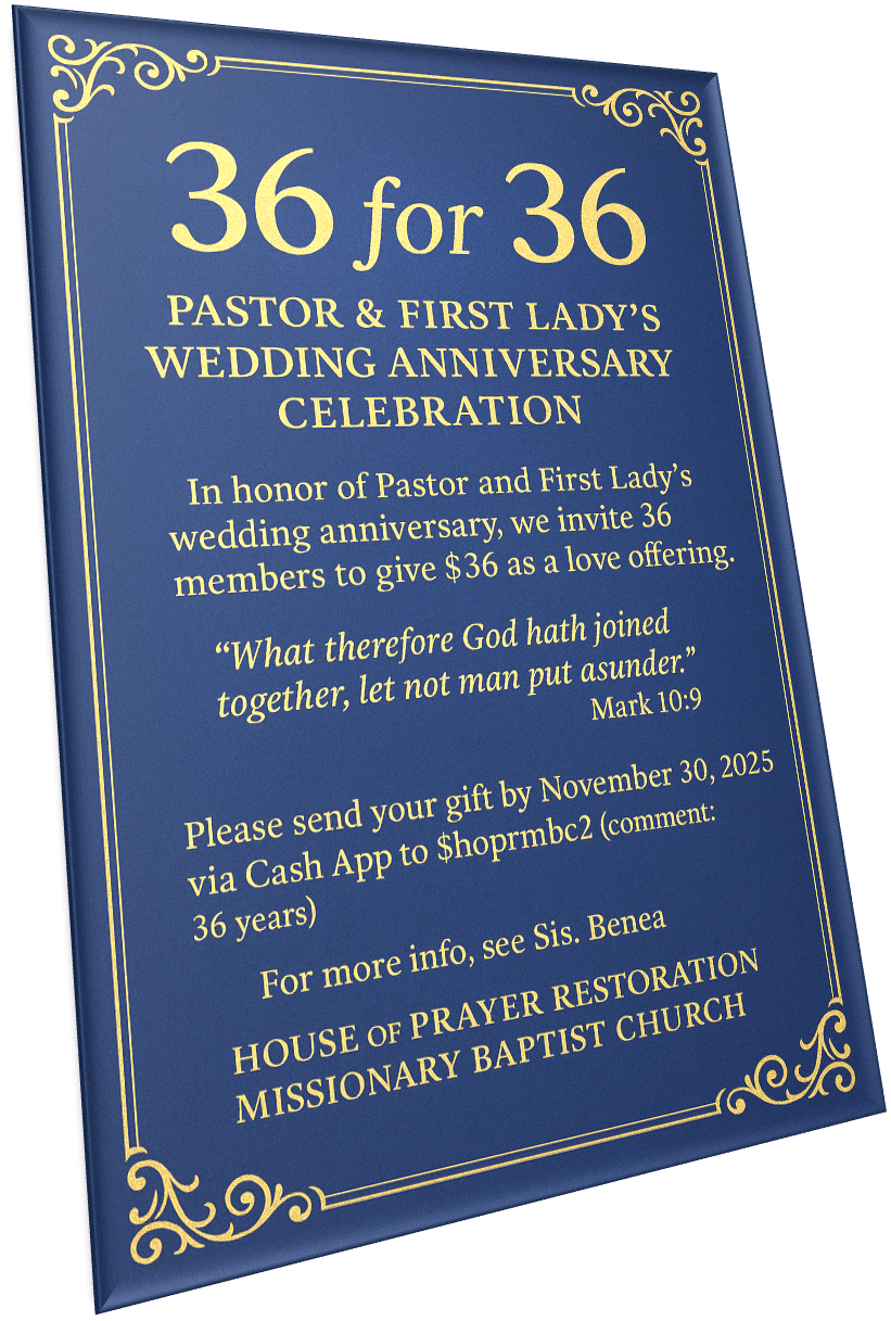 Join us as we honor Reverend Dr. Maddie Turner Jr. and First Lady Tracy Turner on their 36th Wedding Anniversary — a beautiful testament of love, faith, and partnership in serving God’s people. Their unwavering dedication to one another and to the ministry continues to inspire our entire congregation. We invite all members to donate, participate, and celebrate this special milestone as we show our love and appreciation for their many years of service and leadership.
